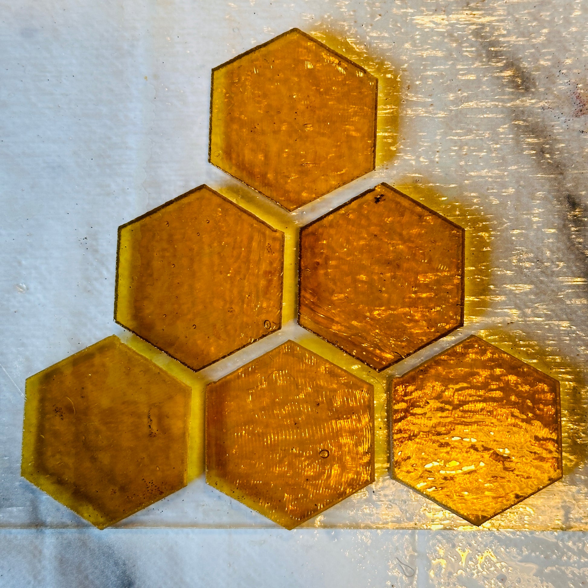 Introducing our Bullseye amber glass hexagon shape. Perfect for fused glass creations and mosaic.